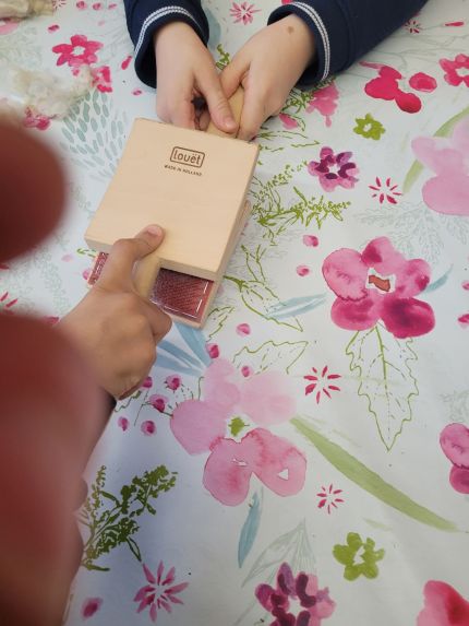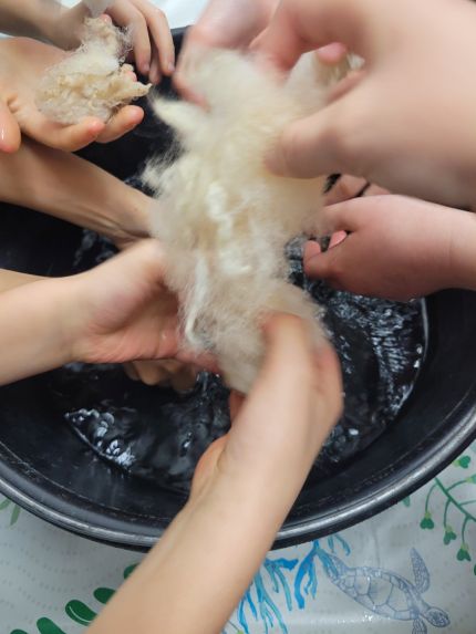 L’animation se poursuit avec la découverte des différentes étapes (laver, écharpiller, carder…) pour passer de la laine qu’on récupère après la tonte à la laine qu’on utilise pour les pulls, écharpes…